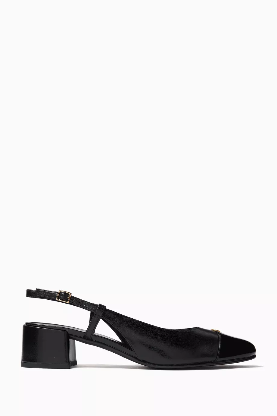 • غطاء مقدمة أنيق: يتميز الحذاء بـ غطاء على المقدمة من نفس لون الجلد الأسود، وهو تفصيل كلاسيكي يمنح الحذاء طابعاً أنثوياً راقياً ويذكرنا بأحذية الباليرينا التقليدية.
