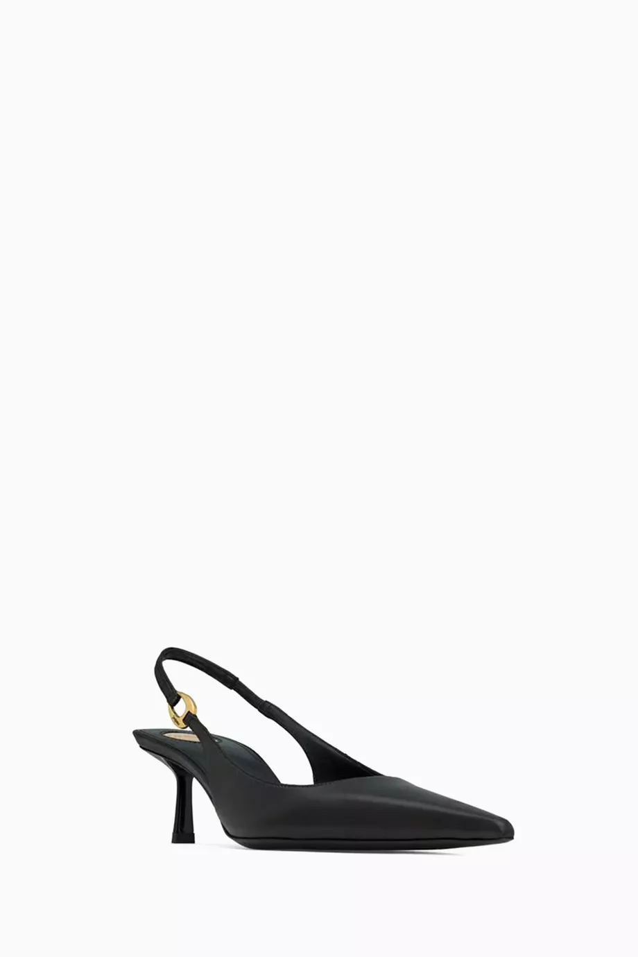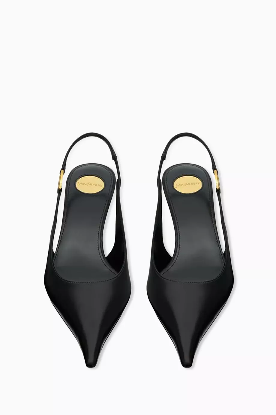 تميّزي بإطلالة أنيقة مع كعب سان لوران الأسود المصنوع من جلد ناعم فاخر ومقدمة مدببة تمنح القدم مظهراً أنثوياً راقياً. التصميم المفتوح من الخلف مزوّد بسير مطاطي لمزيد من الراحة والثبات، بينما تضيف الحلقة المعدنية المحفورة بشعار سان لوران لمسة فاخرة.
