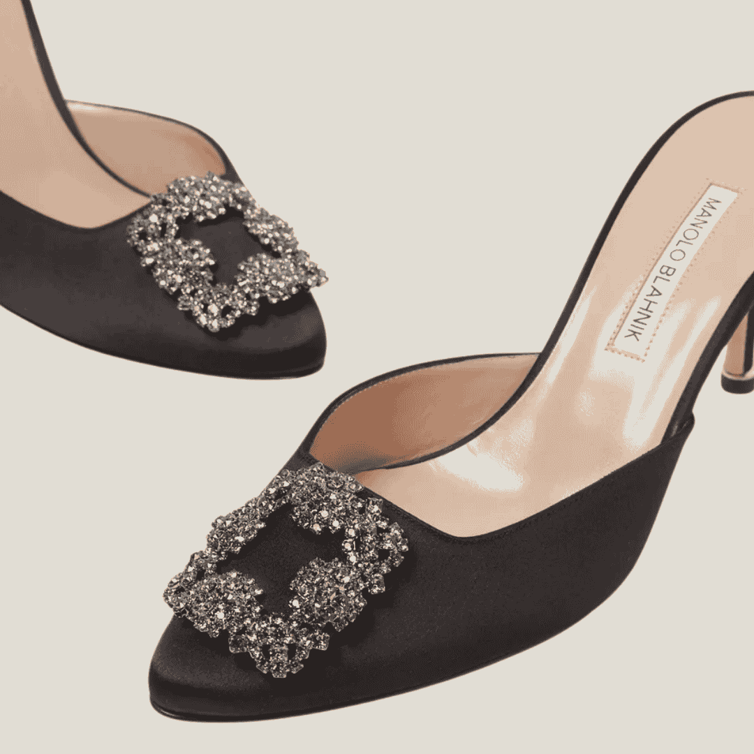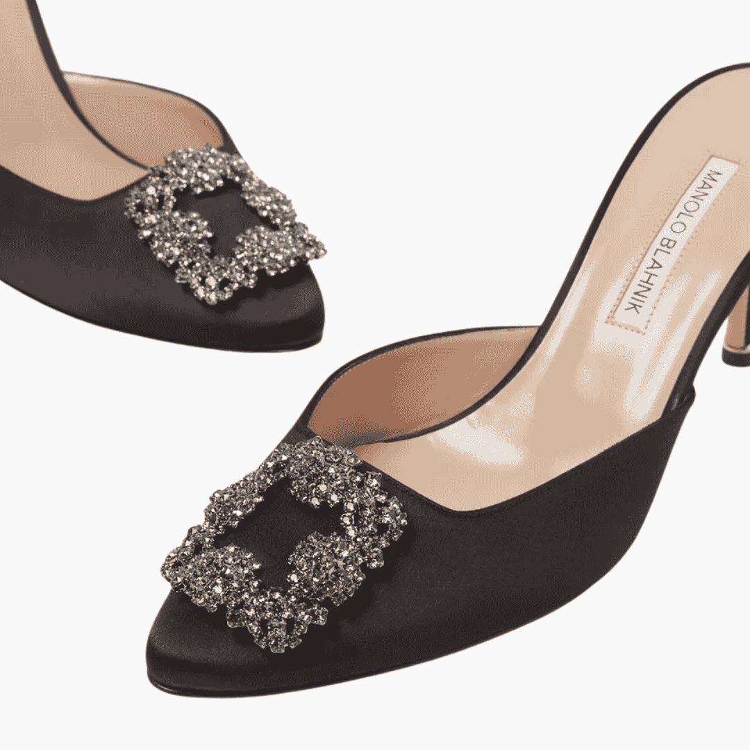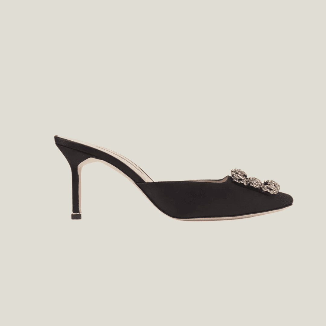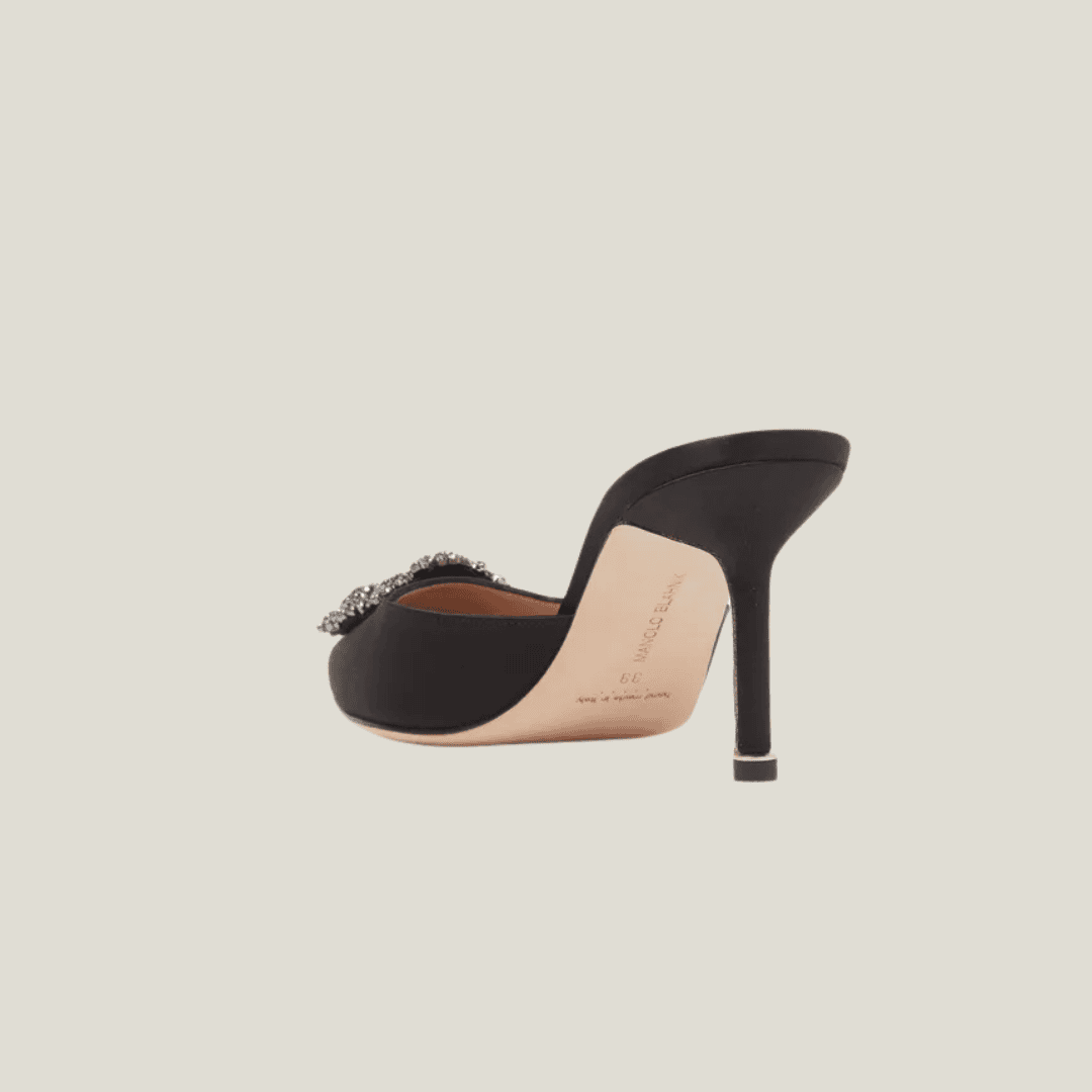 حذاء ميول أسود فاخر من الساتان بمقدمة لوزية، مزوّد بإبزيم كريستالي مربع يضفي لمسة فاخرة، مع كعب متوسط رفيع بارتفاع 70 مم. خامات عالية الجودة وصناعة إيطالية راقية.