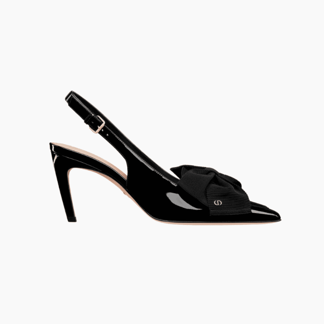 حذاء ديوريسيمو من الجلد الأسود اللامع، مفتوح من الخلف مع فيونكة حريرية مزينة بشعار CD معدني ذهبي، وكعب جرافيكي بارتفاع 8 سم.