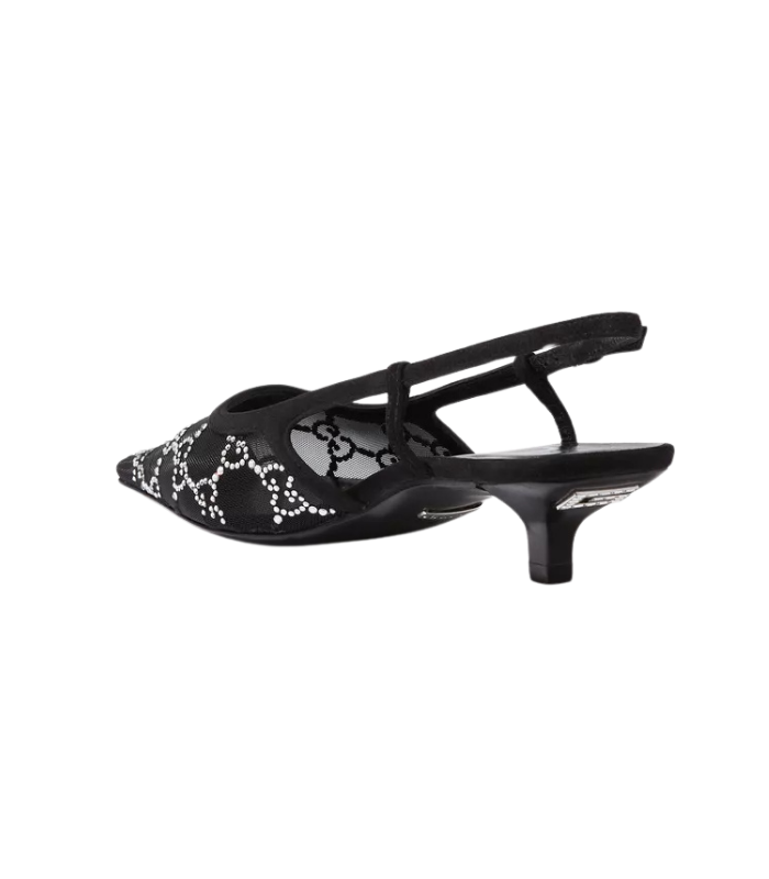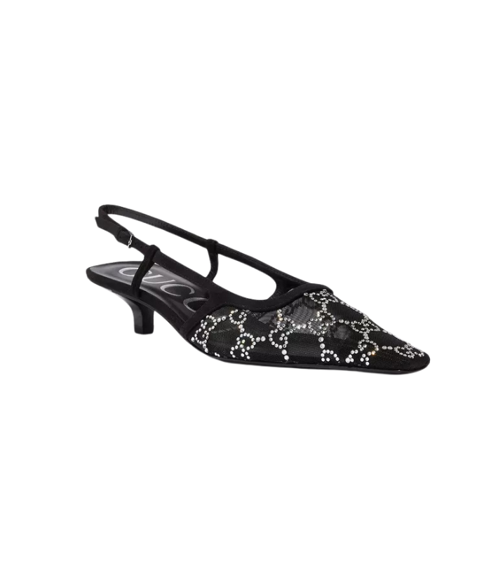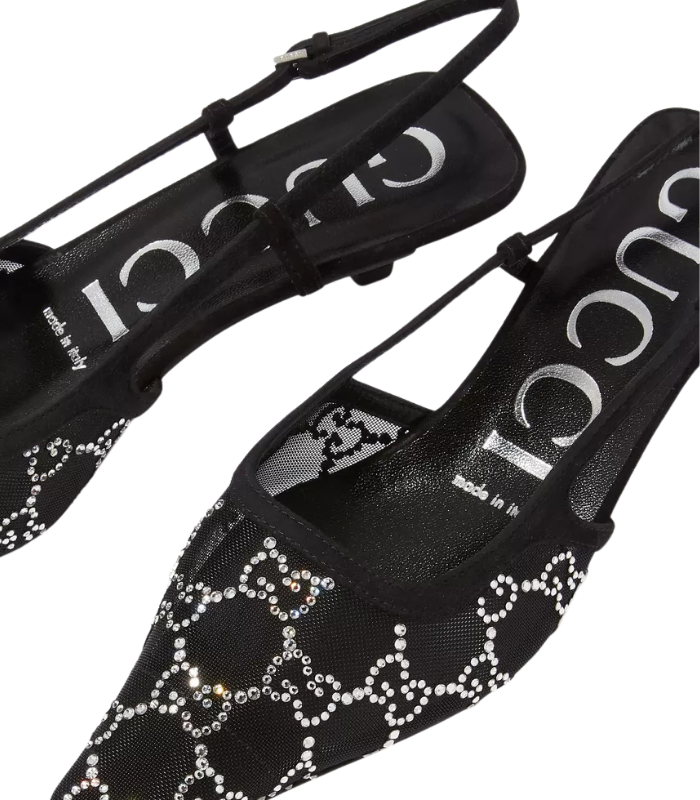 حذاء قوتشي نسائي مرصع بالكريستال، بسير خلفي وإبزيم معدني، وكعب متوسط 35 مم – تصميم فاخر مثالي للإطلالات المسائية.