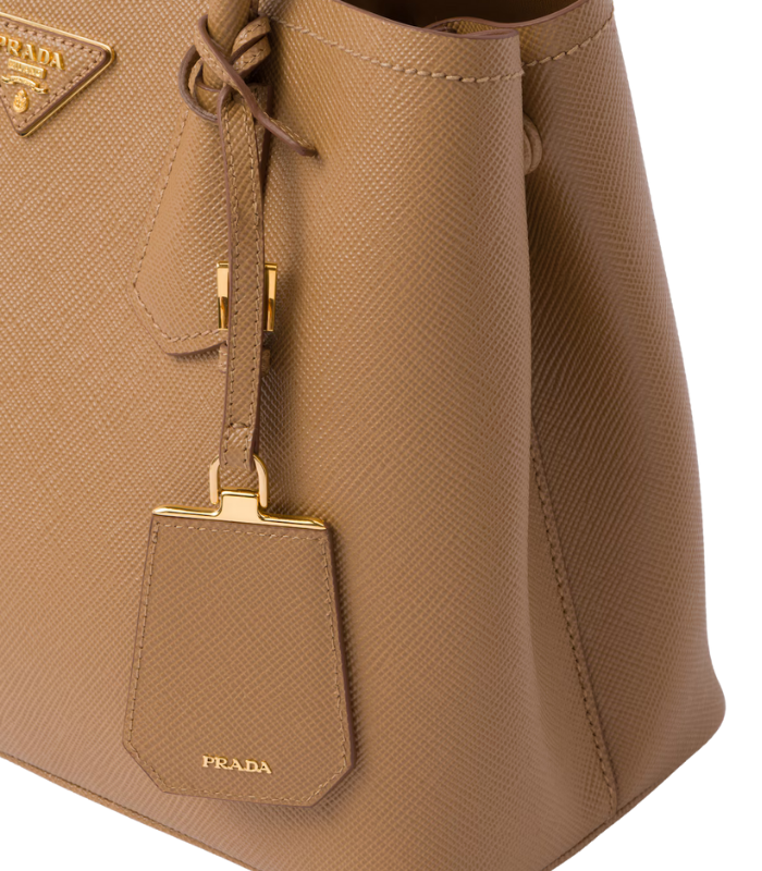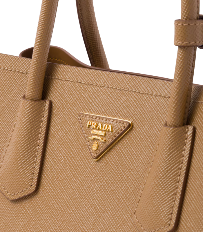 يزيّن الواجهة الأمامية شعار مينا معدني مثلث الشكل مطلي بالذهب، وهو التوقيع الأيقوني لدار Prada.