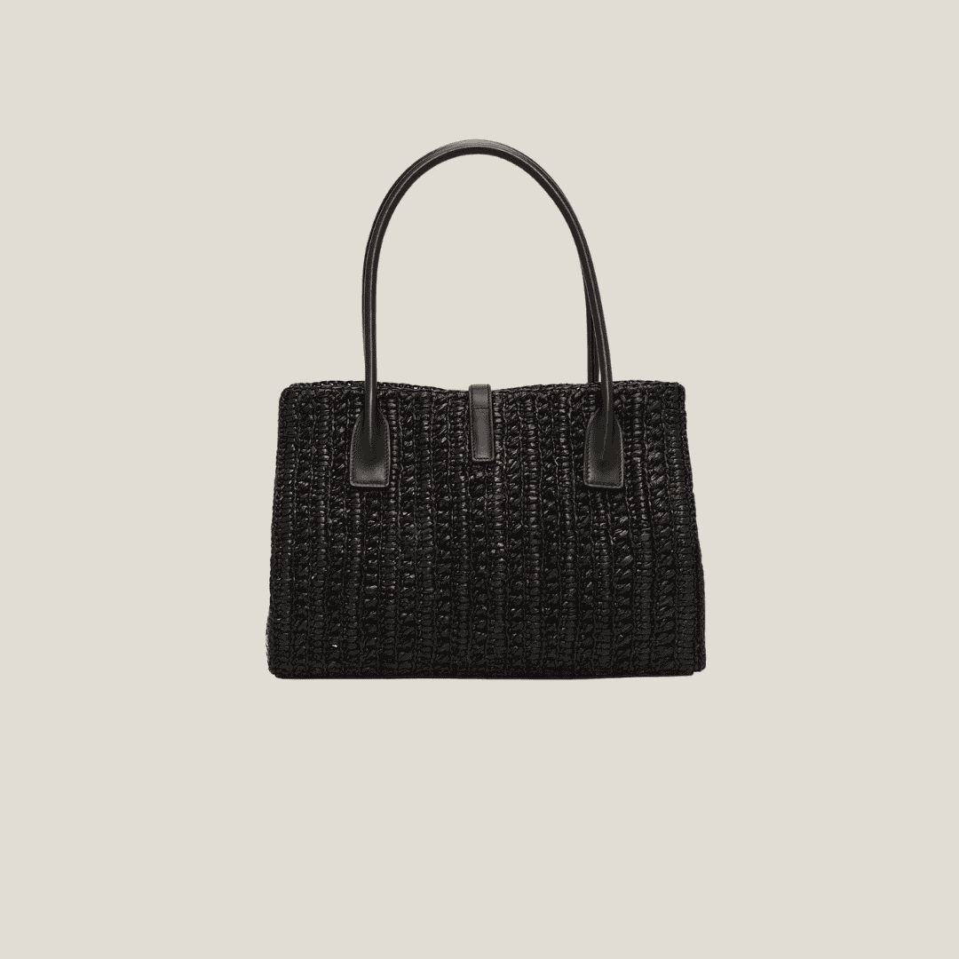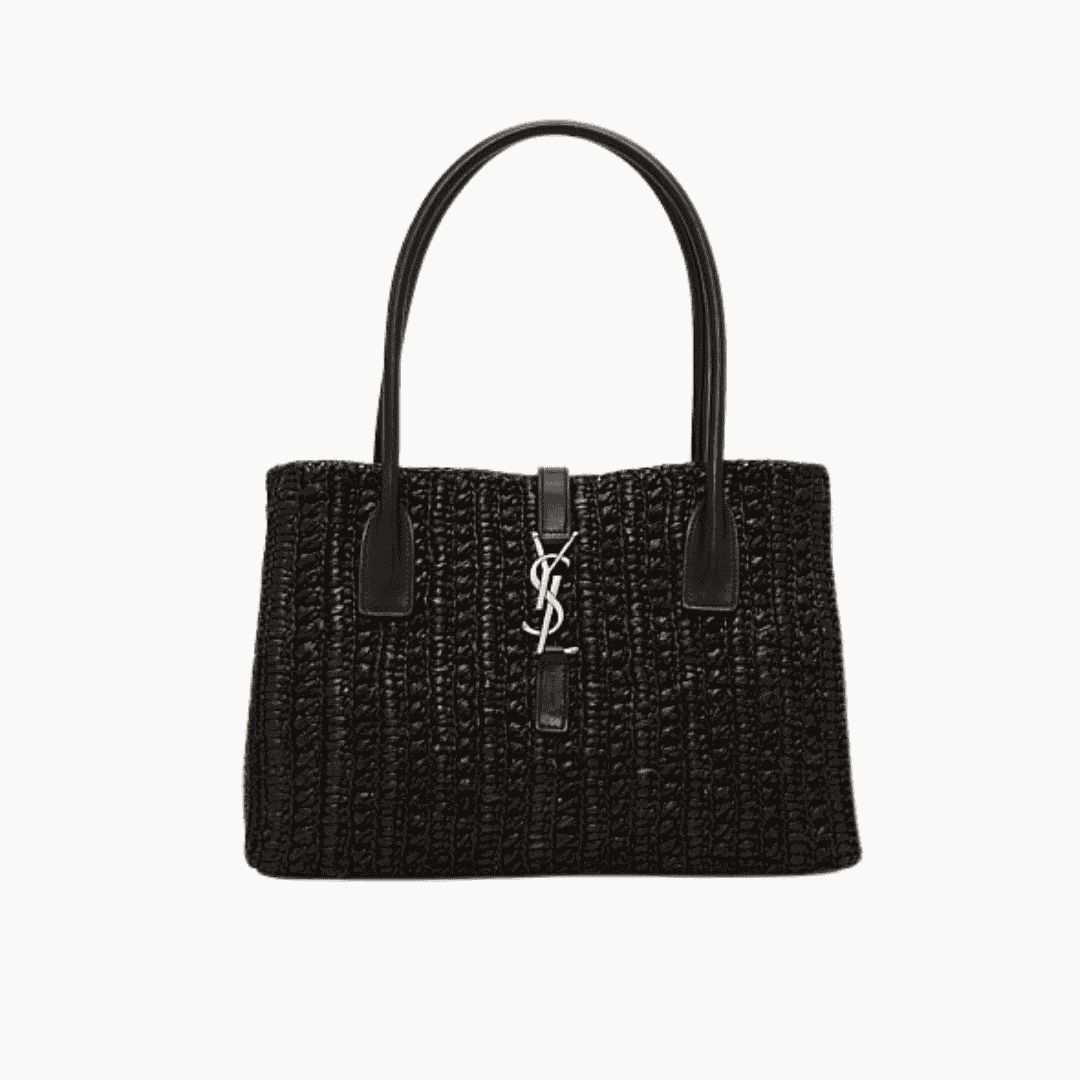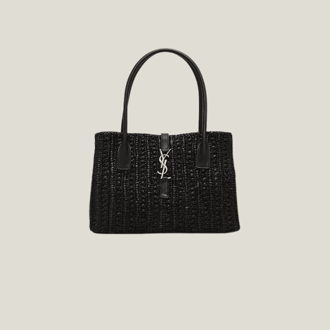 شنطة سان لوران من نسيج الرافيا المتين بلون أسود أنيق، مع لمسات من جلد الطبيعي الفاخر. تصميم فرنسي بسيط وعملي يناسب الإطلالات اليومية ويمنح لمسة جمالية راقية.